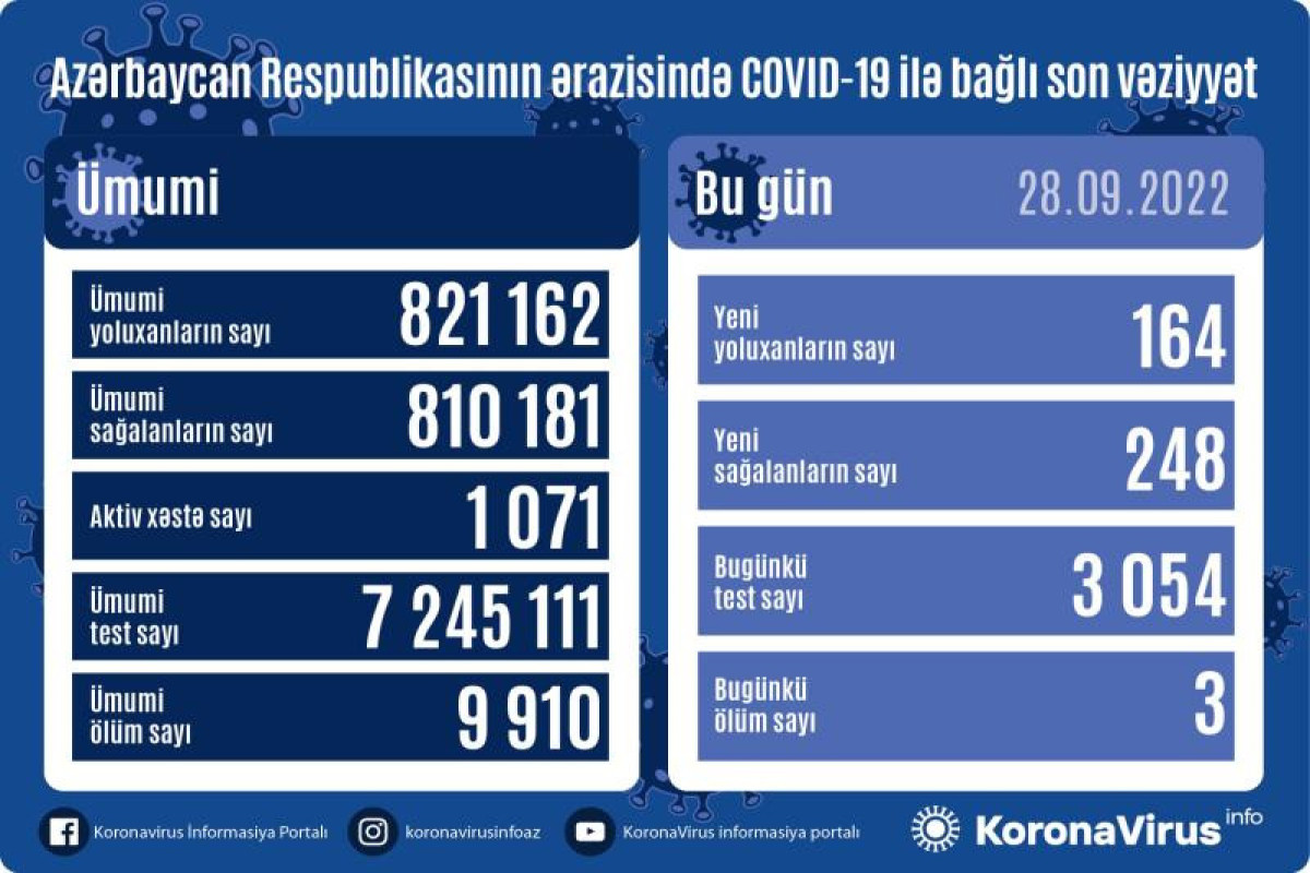 Azərbaycan Respublikasında koronavirus (COVID-19) infeksiyasına 164 yeni yoluxma faktı qeydə alınıb, 248 nəfər müalicə olunaraq sağalıb.