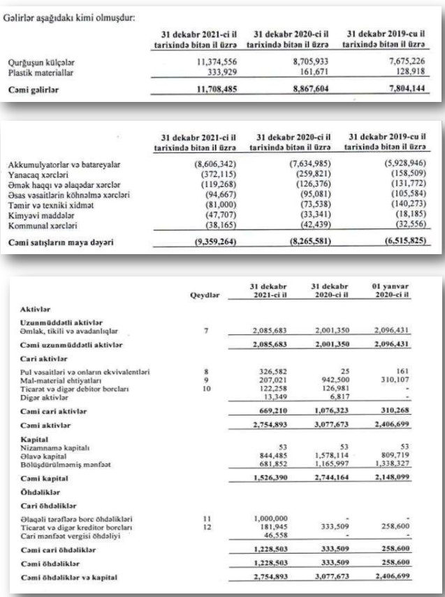Yararsız akkumulyator və qurğuşun tərkibli xammalın toplanılmasını, saflaşdırılmış qurğuşun külçələrin istehsalını və ixracını həyata keçirən "Az-Lead" MMC 2021-ci ili 11 milyon 708 min dollar gəlir və 1 milyon 579 min dollar xalis mənfəət ilə başa vurub.