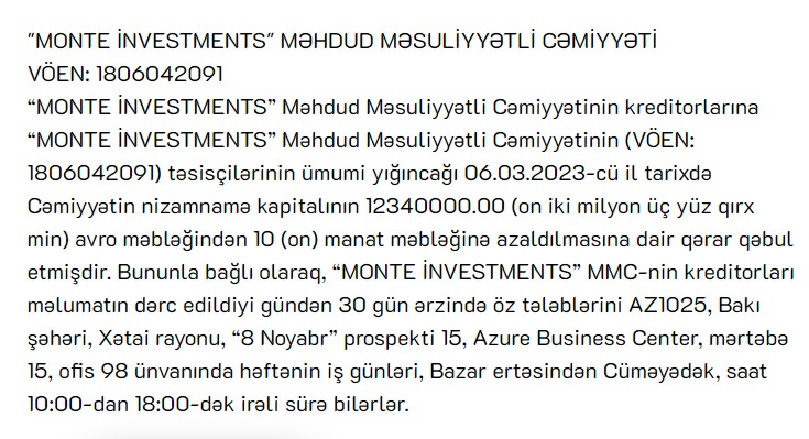 Marja-nın məlumatına görə, "Monte İnvestments" MMC bəyan edib ki, təsisçilərinin 06.03.2023-cü il tarixli ümumi yığıncağının qərarı ilə şirkətin nizamnamə kapitalı 12 milyon 340 min avro məbləğindən 10 manat məbləğinə azaldılmasına dair qərar qəbul edilib. Şirkətin kreditorları məlumatın dərc edildiyi gündən 30 gün ərzində öz tələblərini Bakı şəhəri, Xətai rayonu, “8 Noyabr” prospekti 15, Azure Business Center, mərtəbə 15, ofis 98 ünvanında həftənin iş günləri, Bazar ertəsindən Cüməyədək, saat 10:00-dan 18:00-dək irəli sürə bilərlər.