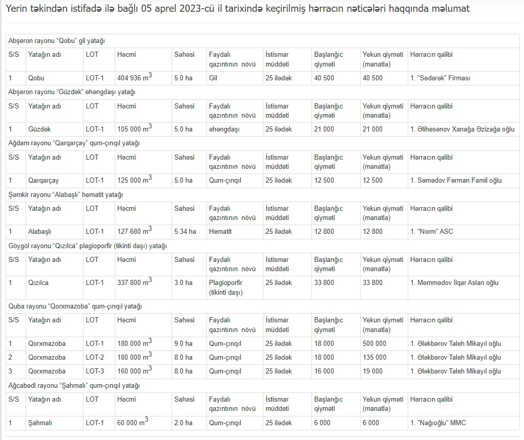 Faydalı qazıntı yataqlarının istifadəyə verilməsi ilə bağlı keçirilən növbəti hərracda Abşeronda yerləşən “Qobu” gil və “Güzdək” əhəngdaşı yataqlarının hər birinin 5 hektar sahəsi, Ağdamda olan “Qarqarçay” qum-çınqıl yatağının 5 hektar, Şəmkirdəki “Alabaşlı” hematit yatağının 5,34 hektar, Göygöldə “Qızılca” plagioporfir yatağının 3 hektar, Qubada “Qorxmazoba” qum-çınqıl yatağının 25 hektar, Ağcabədidə “Şahmalı” qum-çınqıl yatağının isə 2 hektar sahəsi istifadəyə verilib.