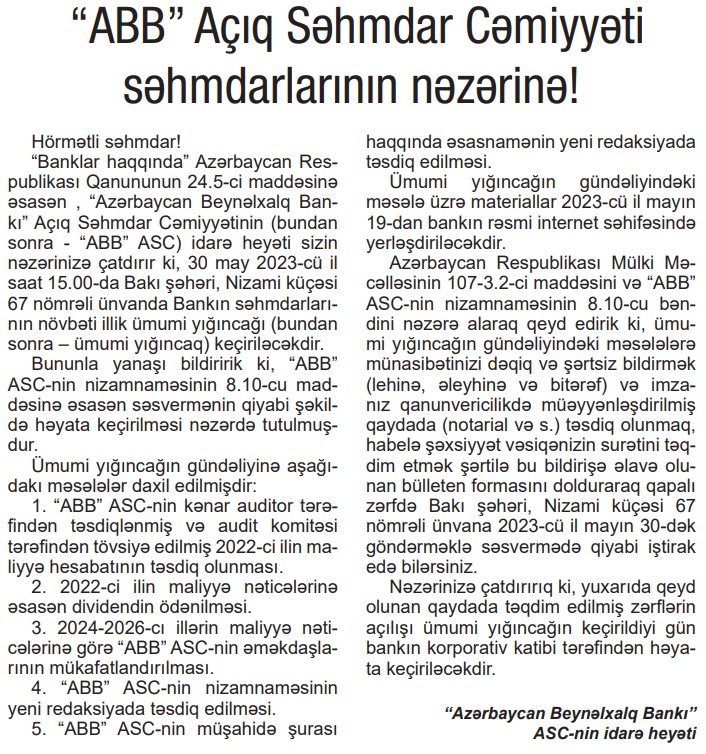 "Azərbaycan Respublikası Mülki Məcəlləsinin 107-3.2-ci maddəsini və “ABB” ASC-nin nizamnaməsinin 8.10-cu bəndini nəzərə alaraq qeyd edirik ki, ümumi yığıncağın gündəliyindəki məsələlərə münasibətinizi dəqiq və şərtsiz bildirmək (lehinə, əleyhinə və bitərəf) və imzanız qanunvericilikdə müəyyənləşdirilmiş qaydada (notarial və s.) təsdiq olunmaq, habelə şəxsiyyət vəsiqənizin surətini təqdim etmək şərtilə bu bildirişə əlavə olunan bülleten formasını dolduraraq qapalı zərfdə Bakı şəhəri, Nizami küçəsi 67 nömrəli ünvana 2023-cü il mayın 30-dək göndərməklə səsvermədə qiyabi iştirak edə bilərsiniz.
