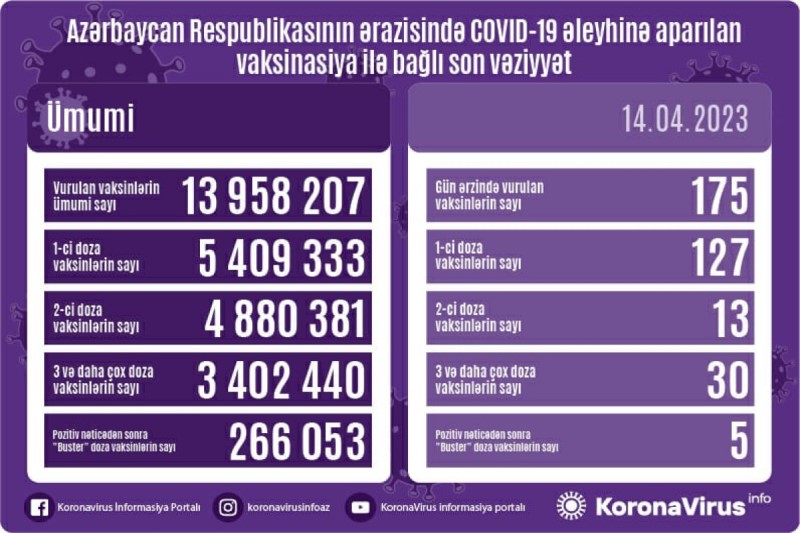 Azərbaycanda son sutkada koronavirus (COVID-19) əleyhinə 175 vaksin vurulub. Nazirlər Kabineti yanında Operativ Qərargahdan APA-ya verilən məlumata görə, bir gündə birinci mərhələ üzrə vaksinasiya olunanların sayı 127, ikinci mərhələ üzrə vaksinasiya olunanların sayı 13, üç və daha çox doza üzrə vaksinasiya olunanların sayı 30, pozitiv nəticədən sonra buster doza üzrə vaksinasiya olunanların sayı 5 nəfərdir.
