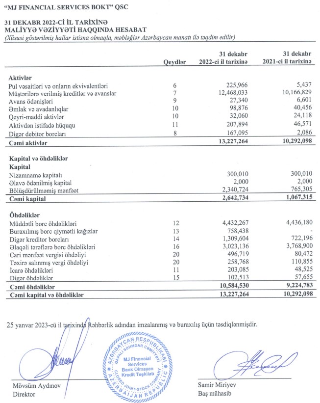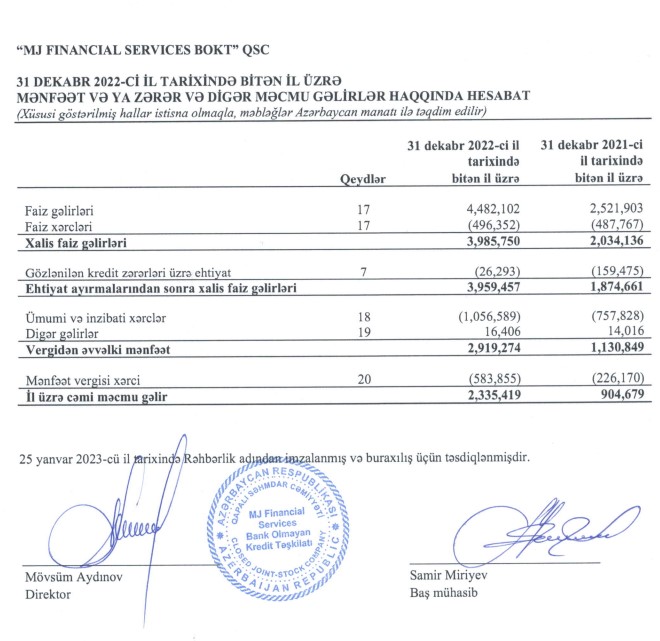“MJ Financial Services BOKT” QSC 2022-ci ili 2 milyon 335 min manat xalis mənfəət ilə başa vurub. Kredit təşkilatı 2021-ci ili 905 min manat xalis mənfəət ilə bağlamışdı. Beləliklə, 2021-ci illə müqayisədə 2022-ci ildə “MJ Financial Services BOKT”un xalis mənfəəti 2,6 dəfə artıb. Xalis mənfəətin artması faiz gəlirlərinin kəskin artmasından qaynaqlanır. Eyni zamanda, təşkilatın faiz xərclərində ciddi artım baş verməmiş, gözlənilən kredit zərərləri üzrə ehtiyata ayırdığı vəsait azalıb.