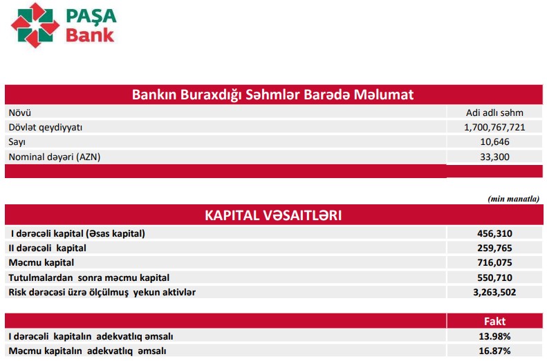 2022-ci ilin sonu ilə müqayisədə 2023-cü ilin ilk rübündə "PAŞA Bank"ın cəmi aktivləri 173 milyon 222 min manat artaraq 31 mart 2023-cü il tarixində 8 milyard 693 milyon 36 min manata, o cümlədən kredit portfeli (müştərilərə verilən kreditlər) 25 milyon 727 min manat artaraq 31 mart 2023-cü il tarixində 2 milyard 753 milyon 791 min manata çatıb.