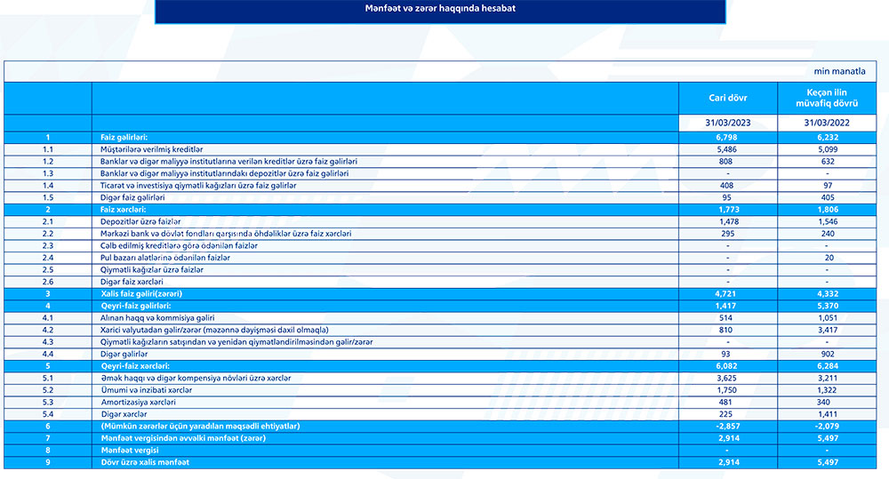 "Bank VTB Azərbaycan" ASC 2023-cü ilin 1-ci rübünü (yanvar-mart) 2 milyon 914 min manat xalis mənfəət ilə başa vurub. Bank ötən ilin eyni dövrünü 5 milyon 497 min manat xalis mənfəət ilə bağlamışdı. Xalis mənfəətin azalması əsasən qeyri-faiz gəlirlərinin azalması ilə əlaqədardır.