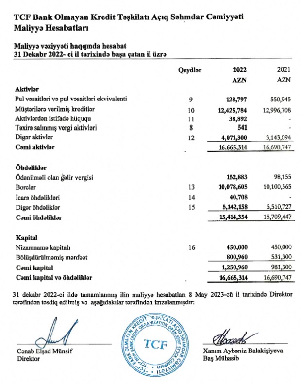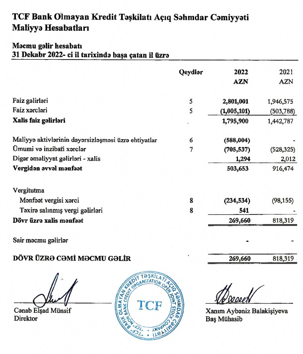 "TCF Bank Olmayan Kredit Təşkilatı" ASC 2022-ci ili 270 min manat xalis mənfəət ilə başa vurub. Təşkilat 2021-ci ili 818 min manat xalis mənfəət ilə bağlamışdı. Beləliklə, "TCF BOKT"ın xalis mənfəəti 2022-ci ildə 2021-ci illə müqayisədə 67% azalıb. Ötən il, təşkilatın gəlirlərindəki artımı maliyyə aktivlərinin dəyərsizləşməsi üzrə ehtiyata ayırma, faiz, ümumi, inzibati və mənfəəti vergisi xərclərinin artması silib.