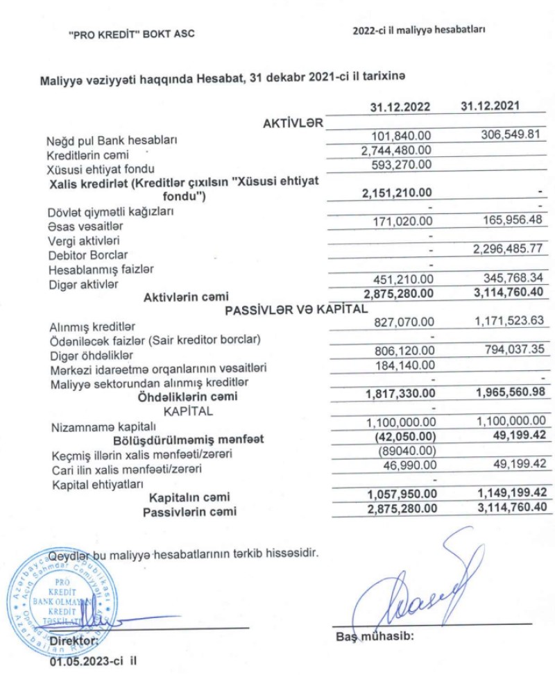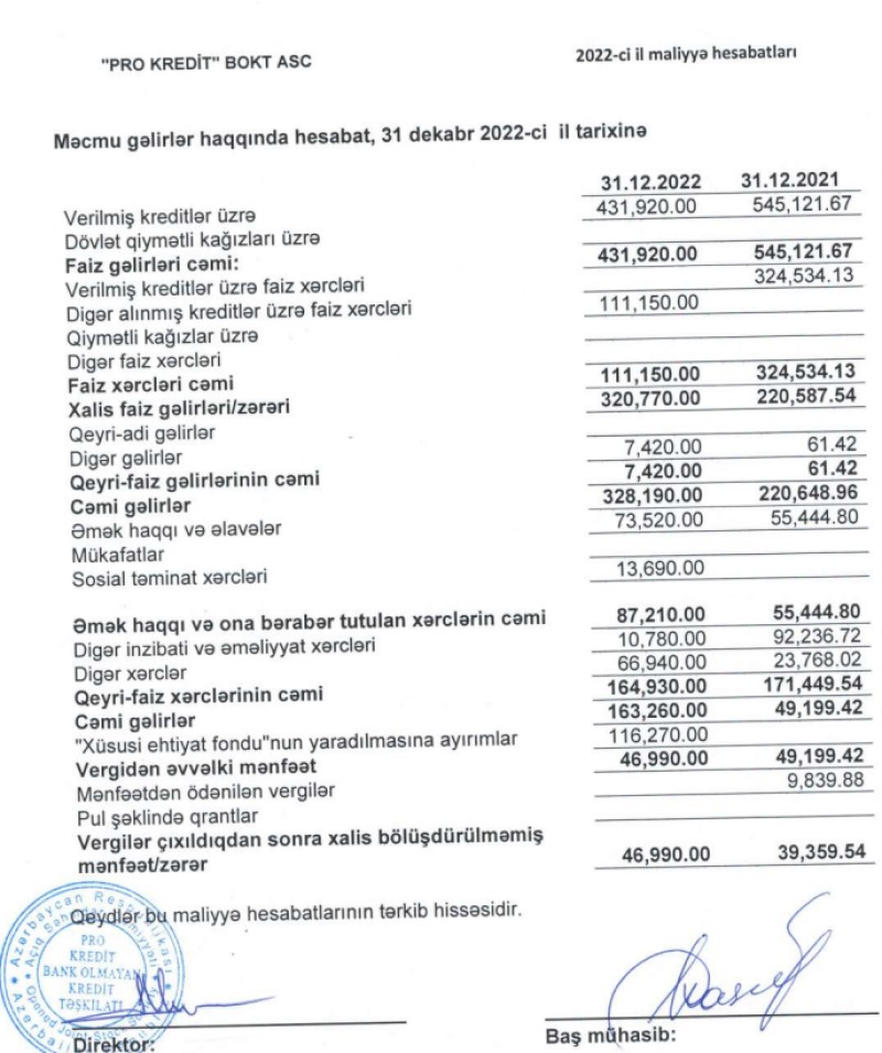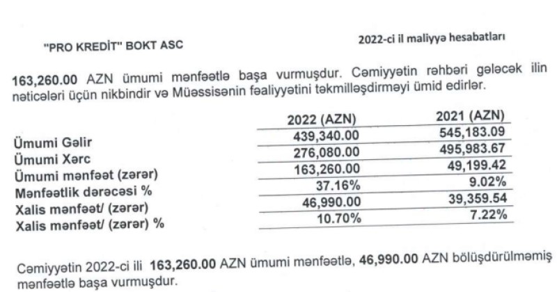 "Pro Kredit" BOKT ASC 2022-ci ili 47 min manat xalis mənfəət ilə başa vurub. Təşkilat 2021-ci ili 39 min manat xalis mənfəət ilə bağlamışdı.