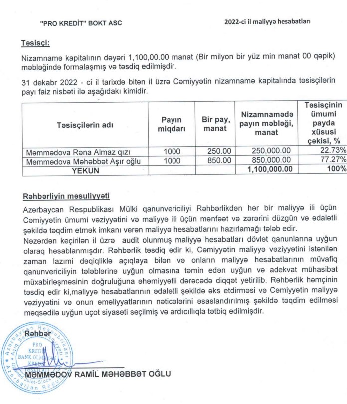 1,1 milyon manat nizamnamə kapitalı olan "ProKredit" BOKT ASC-nin səhmdarları Məmmədova Rəna və Almaz qızı 22,73% və Məmmədov Məhəbbət Aşır oğludur (77,27%).