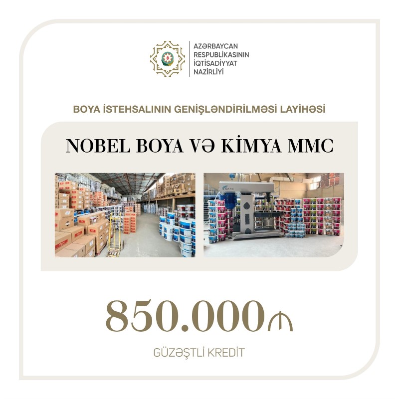 Kredit boya istehsalının genişləndirilməsi layihəsi üçün ayrılıb. kreditin məbləği 850 min manatdır.
