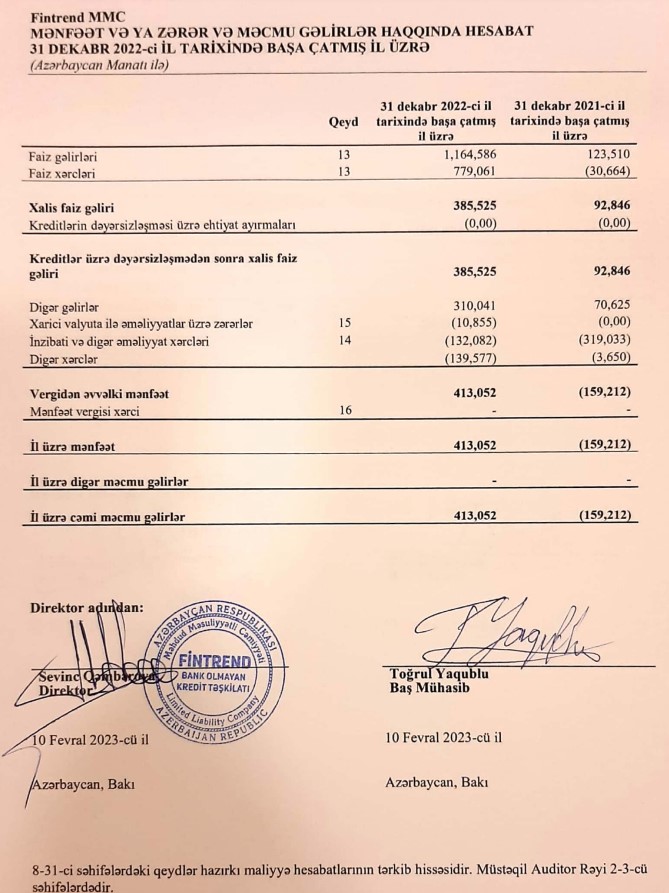 "FinTrend" Bank Olmayan Kredit Təşkilatı (BOKT) 2022-ci ili 413 min manat xalis mənfəət ilə başa vurub. Təşkilat 2021-ci ili 159 min manat xalis zərər ilə bağlamışdı.