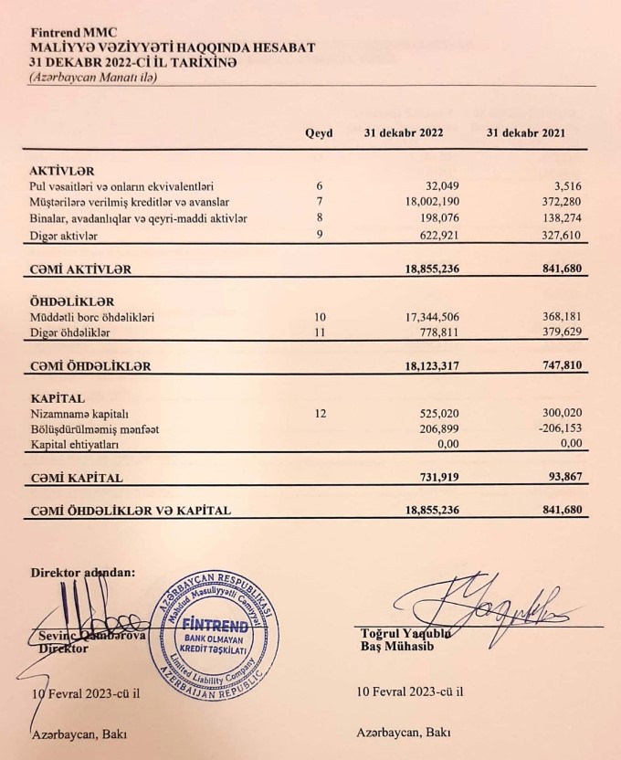 Ötən il "FinTrend"in kredit portfeli (müştərilərə verilmiş kreditlər) 48 dəfədən çox və ya 17 milyon 630 min manat artaraq 31 Dekabr 2022-ci il tarixində 18 milyon 2 min manata çatıb.