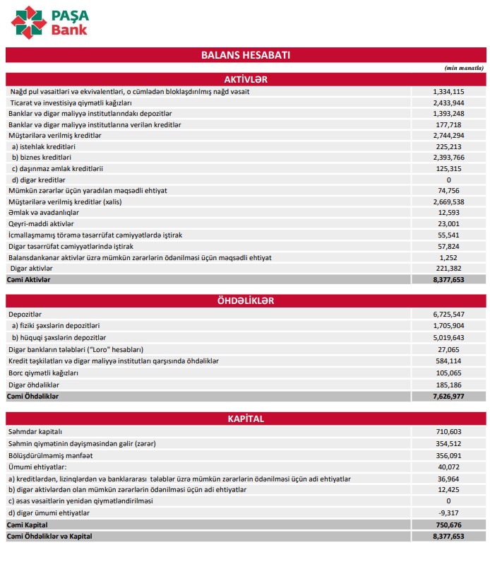 "PAŞA Bank" əməliyyat mənfəəti 31,8% artaraq 123 milyon 532 min manat olub.
