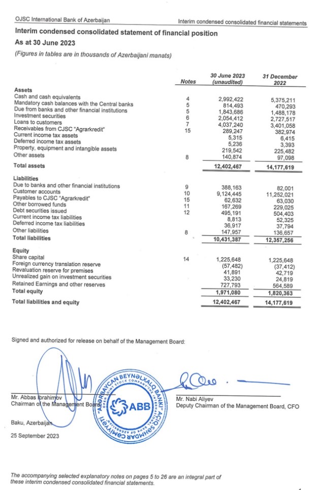 "ABB" ASC (Azərbaycan Beynəlxalq Bankı) 30 iyun 2023-cü il tarixinə olan konsolidə edilmiş maliyyə hesabatlarını açıqlayıb. Konsolidə edilmiş və təhlil olunmuş maliyyə hesabatı "ABB" ASC-nin maliyyə nəticələri ilə bərabər, onun törəmə şirkətlərinin - "ABB-Moskva" bankının, "ABB-GEO" QSC-nin, "Azərikard" MMC-nin, "Beynəlxalq Lizinq Şirkəti" MMC-nin və "ABB-İnvest” QSC-nin (birlikdə Qrup) maliyyə göstəricilərini də əks etdirir.