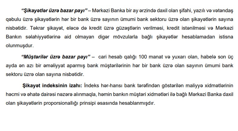 Qeyd edilib ki, bu indeks bankların maliyyə dayanıqlığı və kreditləşmə fəaliyyəti ilə bağlı deyildir. İndeks bank müştərilərinə göstərilən kassa, hesablaşma, kart əməliyyatları və sair xidmətlərlə bağlı Mərkəzi Banka daxil olan şikayətlər əsasında bankların müştəri bazasına proporsional olaraq hesabat ayı üzrə bankların sıralamasını əks etdirir.
