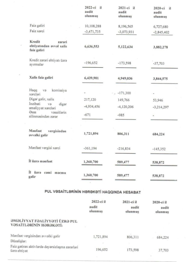 "Kredit Evi"nin faiz gəlirləri 2021-ci ildə 8 milyon 197 min manat ikən, 2022-ci ildə 10 milyon 108 min manata yüksəlib.