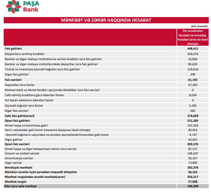 Müqayisə üçün qeyd edək ki, 2022-ci ildə "PAŞA Bank"ın cəmi əməliyyat gəlirləri (faiz və qeyri-faiz gəlirləri) 497 milyon 974 min manat, cəmi əməliyyat xərcləri (faiz və qeyri-faiz xərcləri) 285 milyon 166 min manat, gəlirlər xərcləri üstələdiyindən əməliyyat mənfəəti 212 milyon 808 min manat təşkil etmişdi. Bank əməliyyat mənfəətindən 14 milyon 59 min manat mümkün zərərlər üçün yaradılan məqsədli ehtiyatlara ayırmış və 49 milyon 255 min manat mənfəət vergisi ödəmişdi.