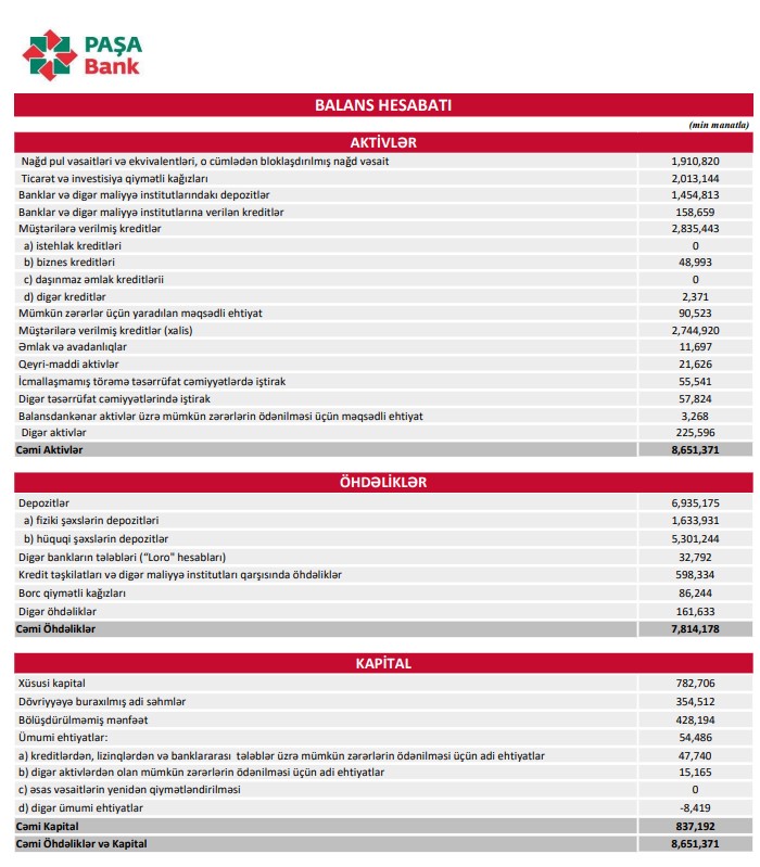 2023-cü ildə "PAŞA Bank"ın cəmi aktivləri 131 milyon 557 min manat və ya 1,5% artaraq 31 dekabr 2023-cü il tarixində 8 milyard 651 milyon 371 min manata çatıb. Bankın kredit portfeli isə (müştərilərə verilmiş kreditlər) 107 milyon 379 min manat və ya 3,9% artaraq 2 milyard 835 milyon 443 min manata yüksəlib.