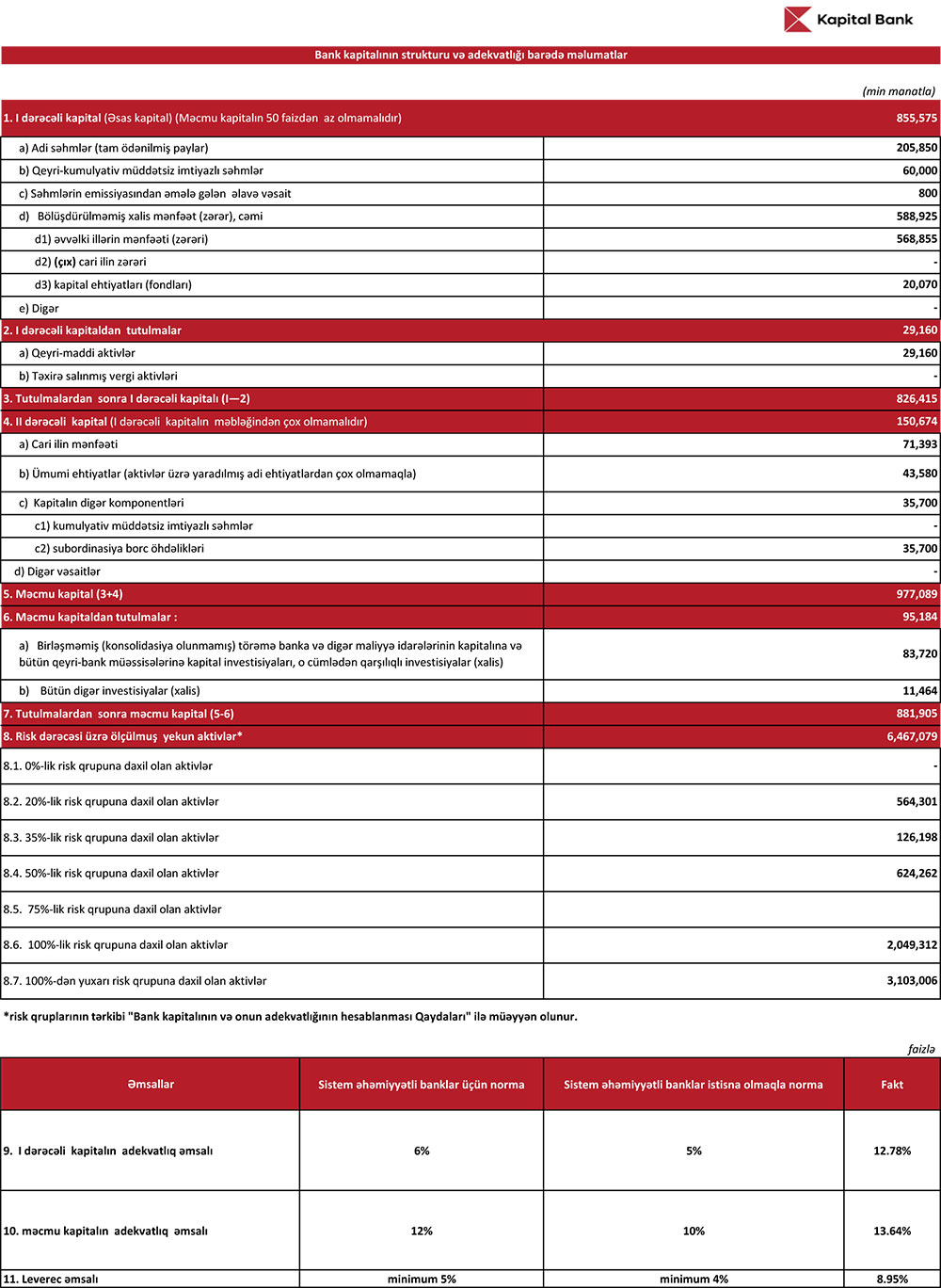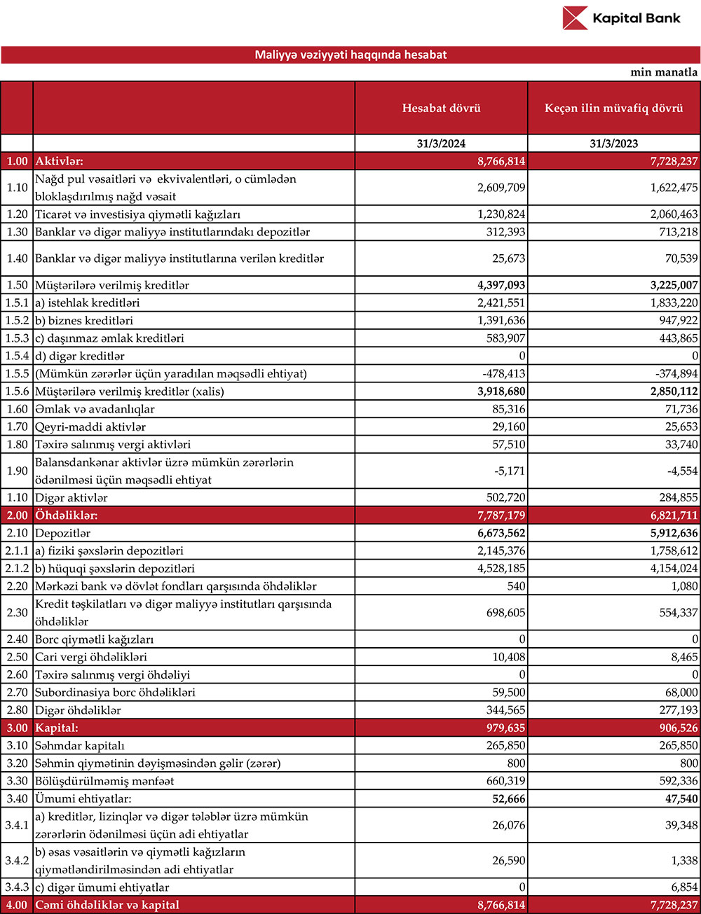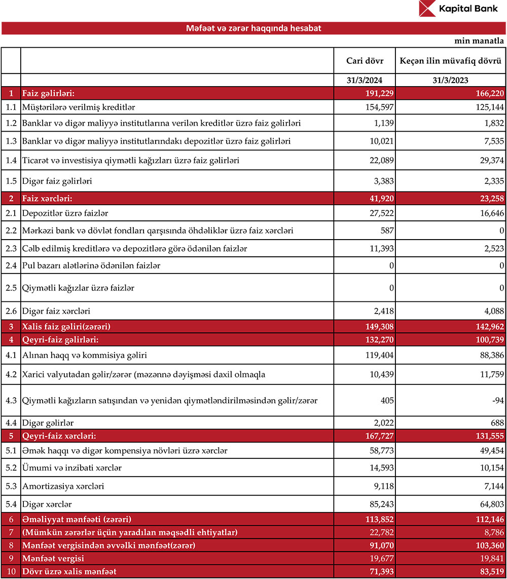 "Kapital Bank" ASC 2024-cü ilin 1-ci rübünü (yanvar-mart) 71 milyon 393 min manat xalis mənfəət ilə başa vurub.