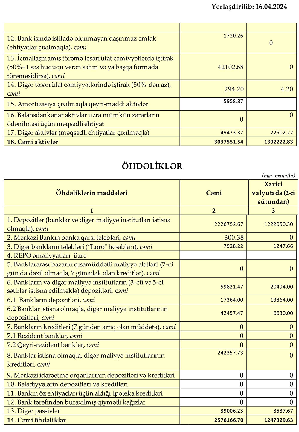 "Xalq Bank" 2024-cü ilin 1-ci rübünü (yanvar-mart) 16 milyon 531 min manat xalis mənfəət ilə başa vurub.
