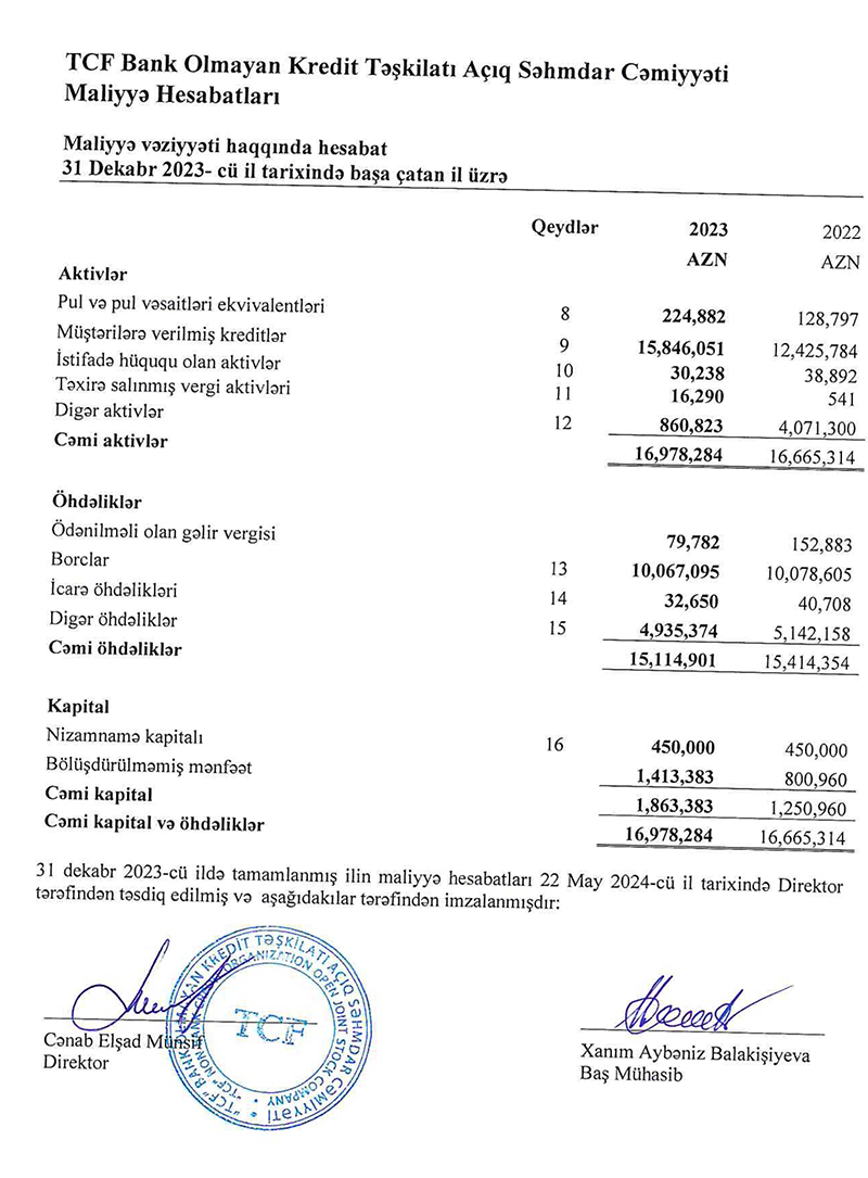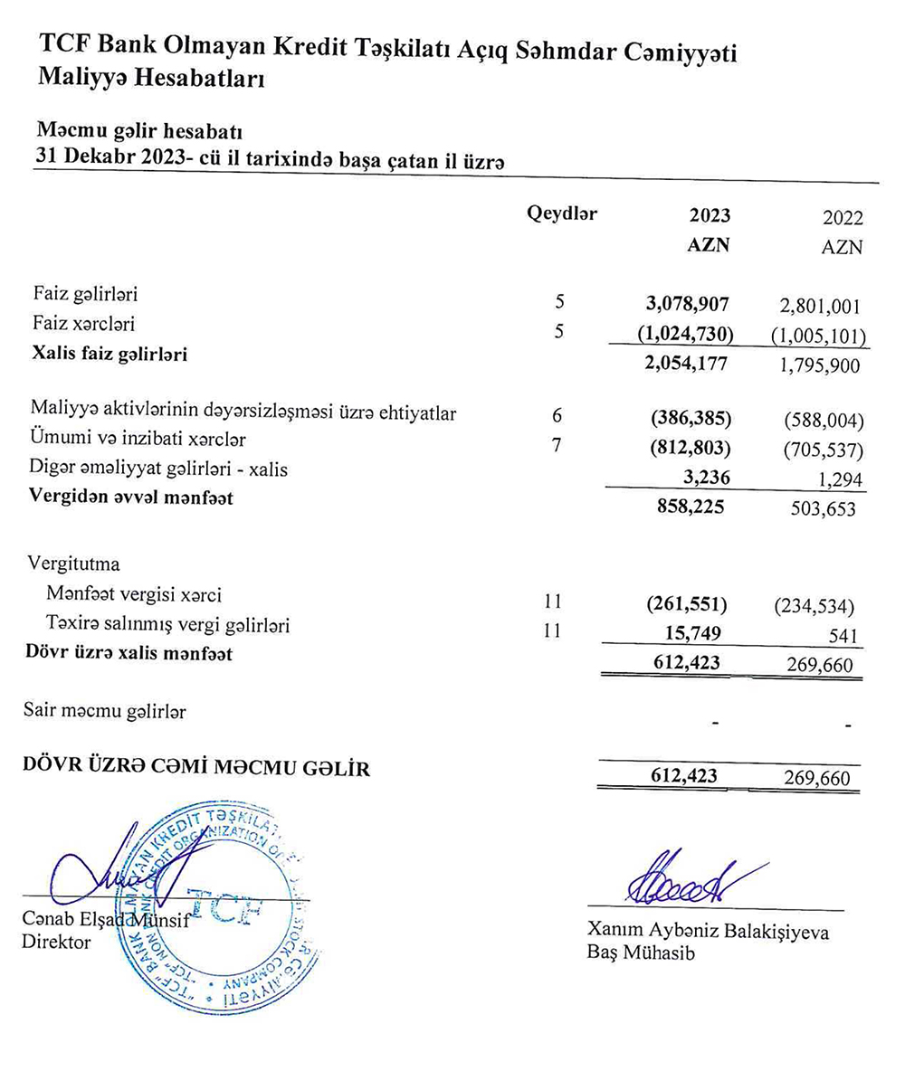 "TCF Bank Olmayan Kredit Təşkilatı" ASC 2023-cü ili 612 min manat xalis mənfəət ilə başa vurub. Kredit şirkəti 2022-ci ili 270 min manat xalis mənfəət ilə bağlamışdı. Beləliklə, "TCF BOKT"ın xalis mənfəəti 2023-cü ildə 2022-ci illə müqayisədə təxminən 2,3 dəfə və ya 342 min manat artıb.