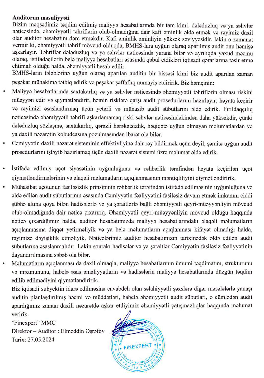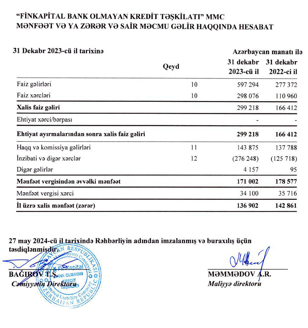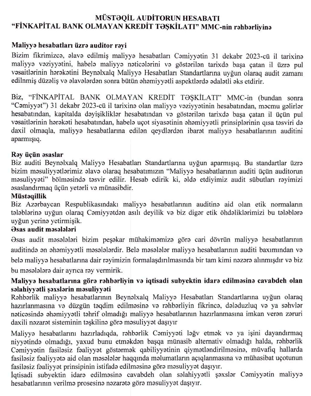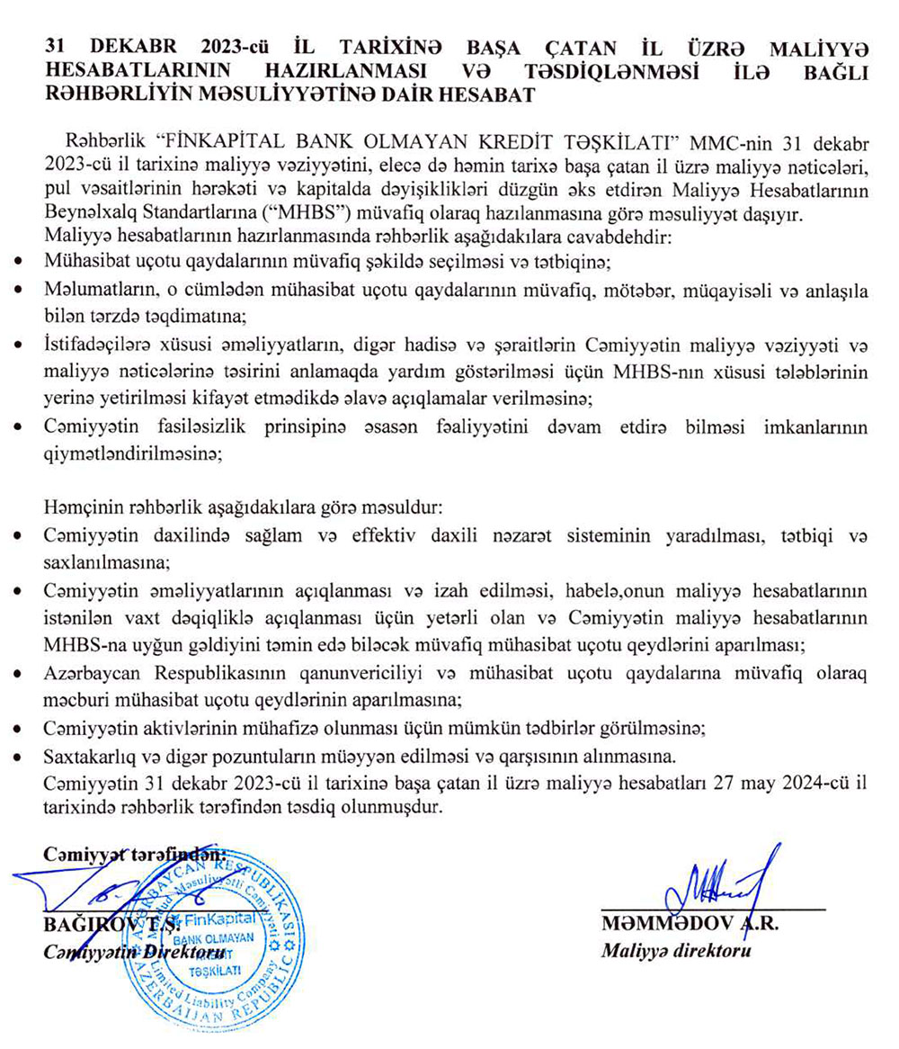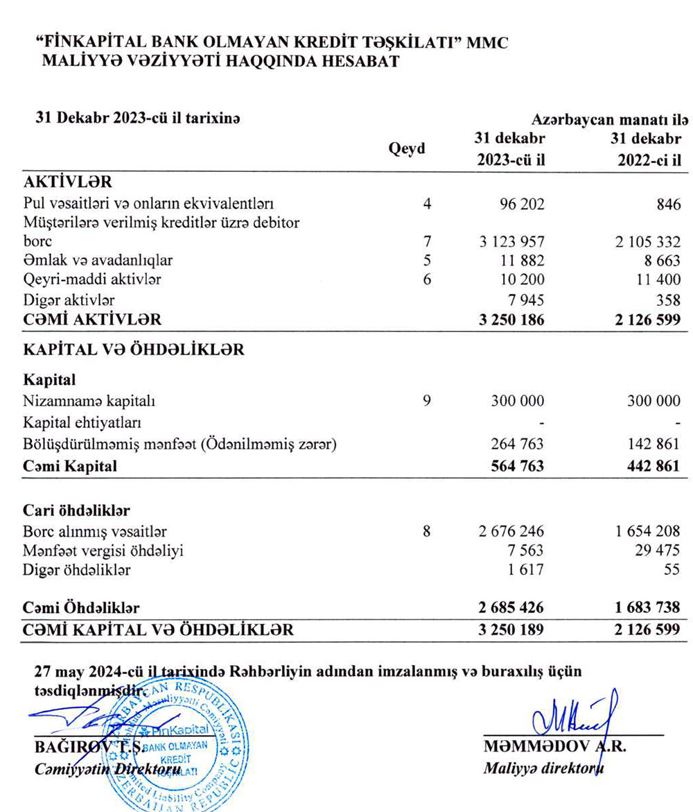 “FinKapital BOKT” MMC -nin 31 dekabr 2023-cü il tarixində bitən il üzrə maliyyə hesabatları