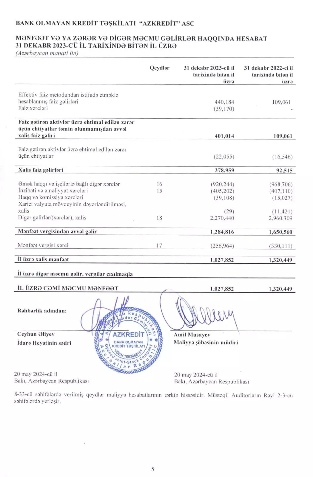 "BOKT AzKredit" ASC 2023-cü ili 1 milyon 28 min manat xalis mənfəət ilə başa vurub. Kredit şirkəti 2022-ci ili 1 milyon 320 min manat xalis mənfəət ilə bağlamışdı. Beləliklə, "BOKT AzKredit"in xalis mənfəəti 2023-cü ildə 2022-ci illə müqayisədə 293 min manat və ya 22,2% azalıb.