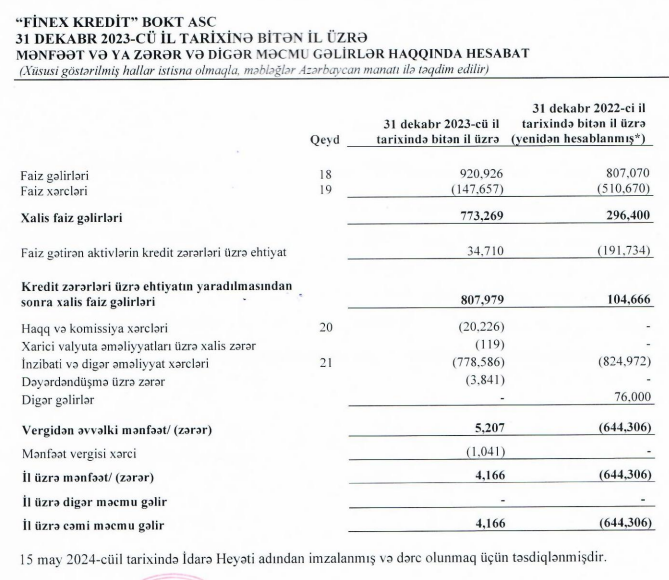 Qeyd edək ki, “Finex Kredit” BOKT ASC 2023-cü ili 4 min 166 manat xalis mənfəət ilə başa vurub. Ehtimal olunan kredit zərərləri üçün yaradılan ehtiyatdan qayıdan vəsaitin, inzibati və digər əməliyyat xərclərinin azalması hesabın Təşkilat cüzi xalis mənfəət əldə edib. “Finex Kredit” 2022-ci ili 644 min manat xalis zərər ilə bağlamışdı.