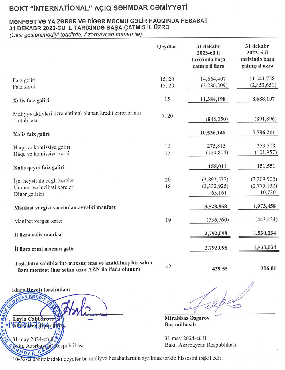"Bank Olmayan Kredit Təşkilatı İnternational" ASC 2023-cü ili 2 milyon 792 min manat xalis mənfəət ilə başa vurub. Təşkilat 2022-ci ili 1 milyon 530 min manat xalis mənfəət ilə bağlamışdı. Beləliklə, "BOKT İnternational"ın xalis mənfəəti 2023-cü ildə 2022-ci illə müqayisədə 1 milyon 262 min manat və ya 82,5% artıb.