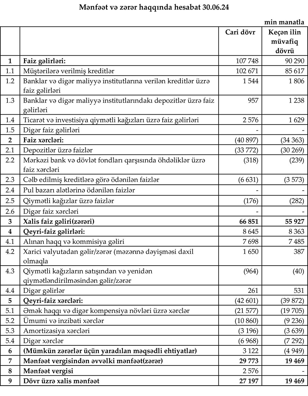 Həmçinin, ilk 6 ayda Bank əməliyyat mənfəətindən 3 milyon 122 min manat mümkün zərərlər üçün yaradılan məqsədli ehtiyatlara ayırıb. 2023-cü ilin eyni dövründə "AccessBank" əməliyyat mənfəətindən 4 milyon 949 min manat ehtiyata ayırmışdı.