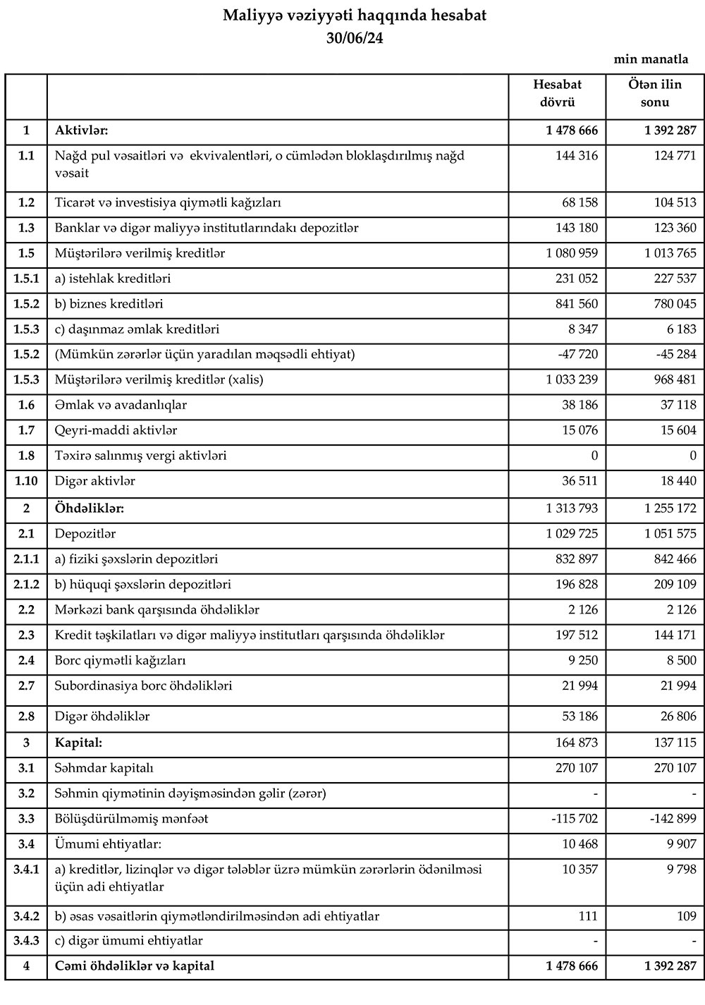 2024-cü ilin yanvar-iyun dövründə "AccessBank" ın cəmi aktivləri 86 milyon 379 min manat və ya 6,2% artaraq 1 milyard 478 milyon 666 min manata yüksəlib. Bankın kredit portfeli (müştərilərə verilmiş cəmi kreditlər) 67 milyon 194 min manat və ya 6,6 % artaraq 1 milyard 80 milyon 959 min manata çatıb. O cümlədən, istehlak kreditləri portfeli 3 milyon 515 min manat artaraq 231 milyon 52 min manata, biznes kreditləri portfeli 61 milyon 515 min manat artaraq 841 milyon 560 min manata, ipoteka kreditləri portfeli 2 milyon 164 min manat artaraq 8 milyon 347 min manata qalxıb.