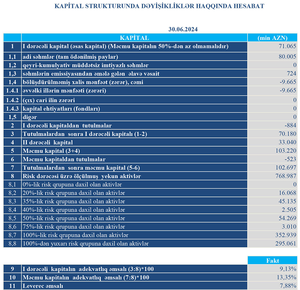 30 İyun 2024-cü il tarixində “Turan Bank” ASC 102 milyon 697 min manat məcmu kapitala malik olub. Bank ötən ilin sonunda 85 milyon 116 min manat məcmu kapitala malik idi.