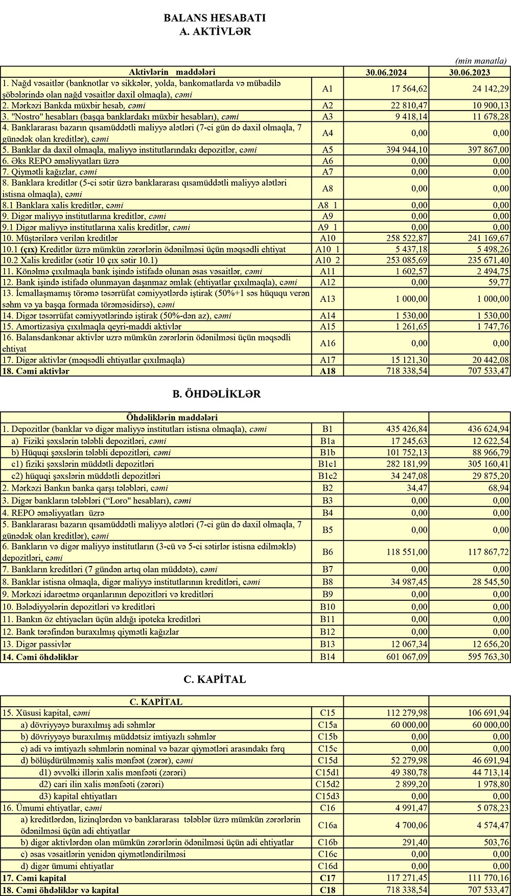 2024-cü ilin ilk 6 ayı ərzində ASB-də cəmi depozitlər 1 milyon 198 min manat və ya 0,3% artaraq milyon 435 milyon 427 min manata yüksəlib..
