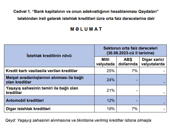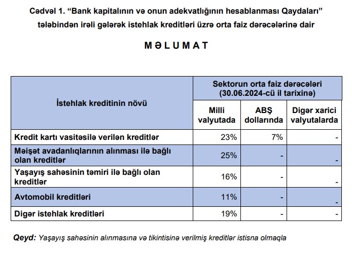Azərbaycan Mərkəzi Bankı “Bank kapitalının və onun adekvatlığının hesablanması Qaydaları” tələbindən irəli gələrək istehlak kreditləri üzrə orta faiz dərəcələrinə dair məlıumat açıqlayıb.