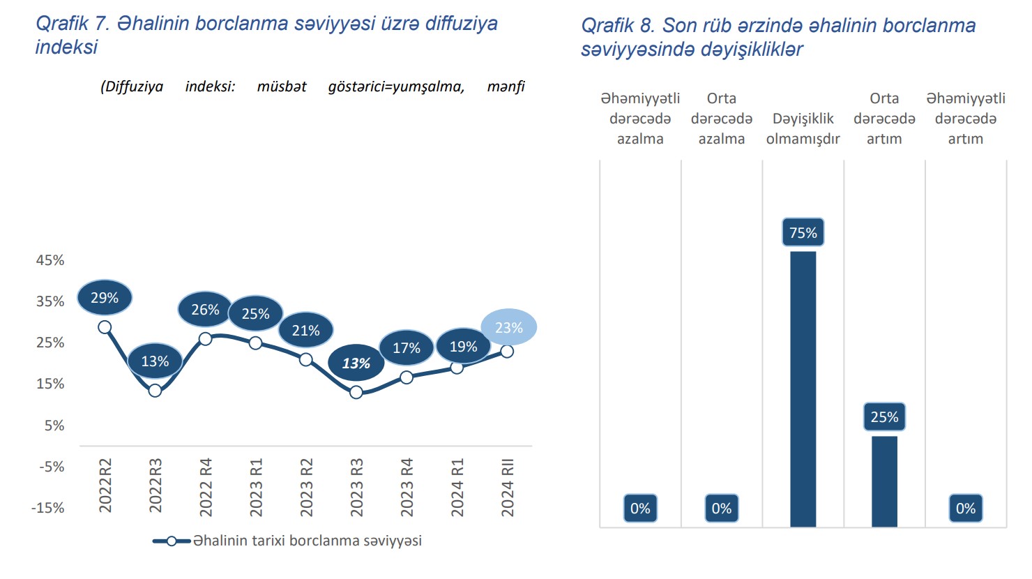 Əhalinin borclanma səviyyəsi üzrə uzunmüddətli diffuziya indeksi 2024-cü ilin II rübündə 4 faiz bəndi artaraq 23% təşkil etmişdir.