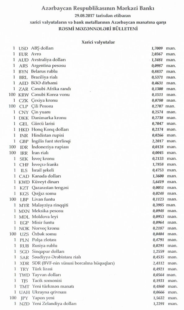 Avqustun 29-na Mərkəzi Bankın açıqladığı rəsmi Dollar/manat məzənnəsi Avqustun 28-i ilə müqayisədə dəyişməyərək 1,7009 manat olub, Avro/manat məzənnəsi isə 2.0367 manata qalxıb.