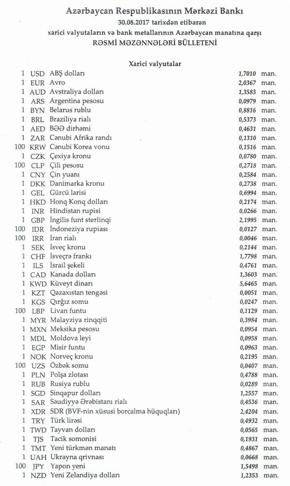 Avqustun 30-na Mərkəzi Bankın açıqladığı rəsmi Dollar/manat məzənnəsi Avqustun 29-u ilə müqayisədə qalxaraq 1,7010 manat olub, Avro/manat məzənnəsi isə 2.367 manata bərabərdir.