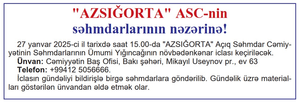 27 yanvar 2025-ci il tarixində "Azsığorta" ASC səhmdarlarının Ümumi Yığıncağının növbədənkənar iclası keçiriləcək.