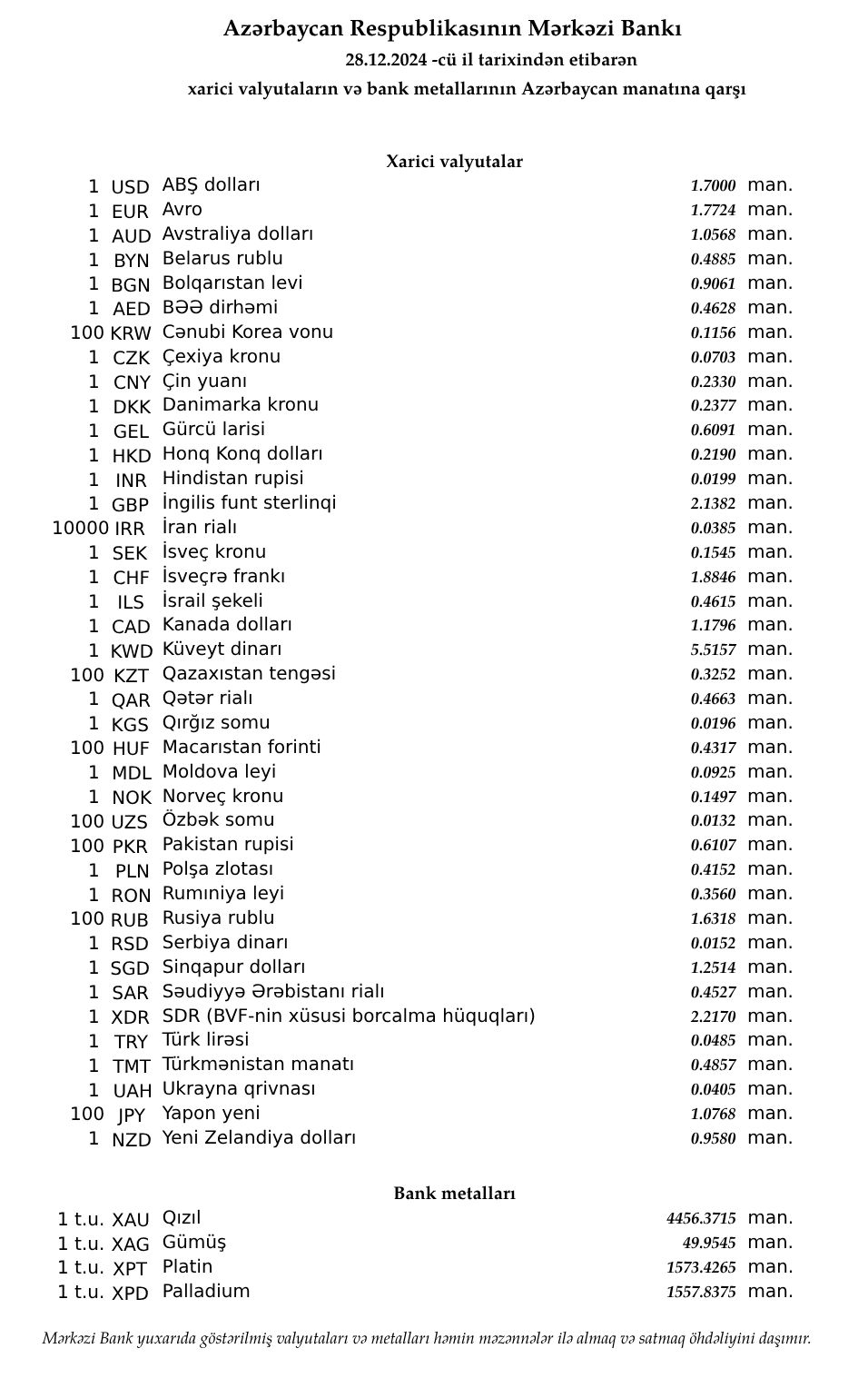 Dolların bazar ertəsi üçün rəsmi məzənnəsi müəyyən olunub