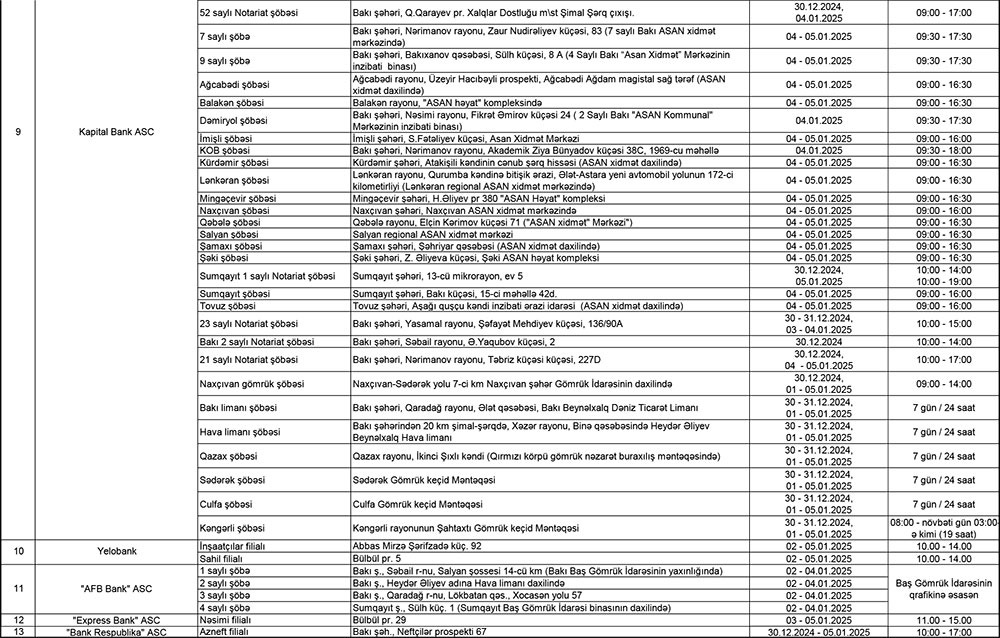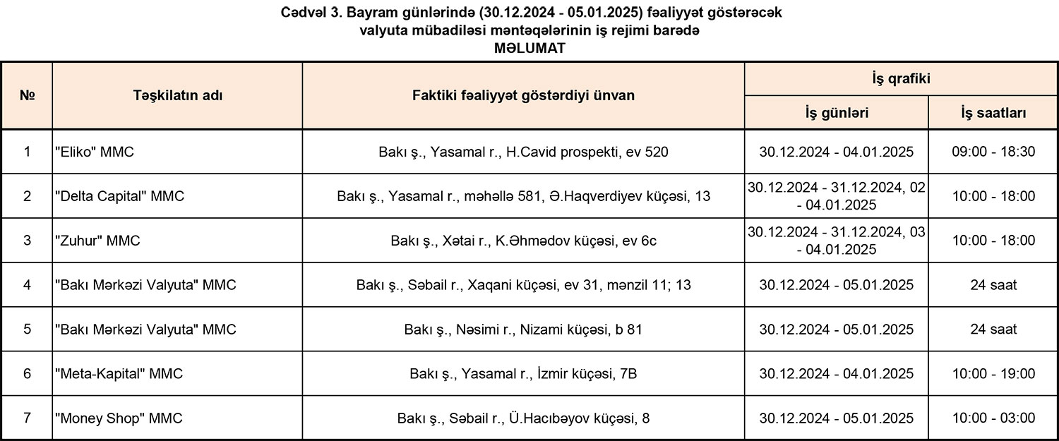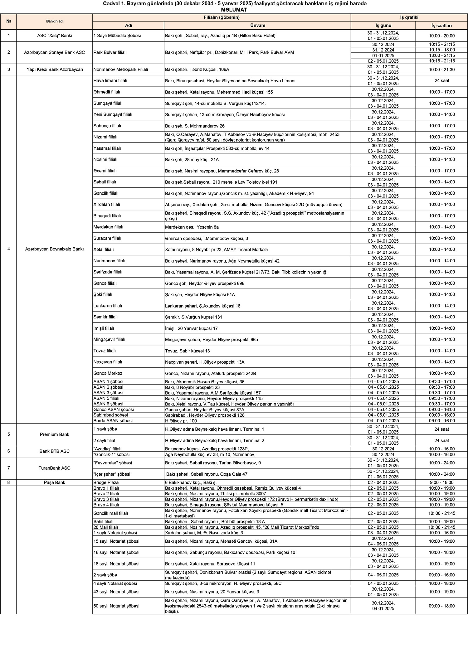 5 yanvar 2025–ci tarixləri olan qeyri-iş günlərində bankların və “Azərpoçt” MMC-nin bəzi filial və şöbələri, habelə valyuta mübadilə məntəqələri fəaliyyət göstərəcəklər.