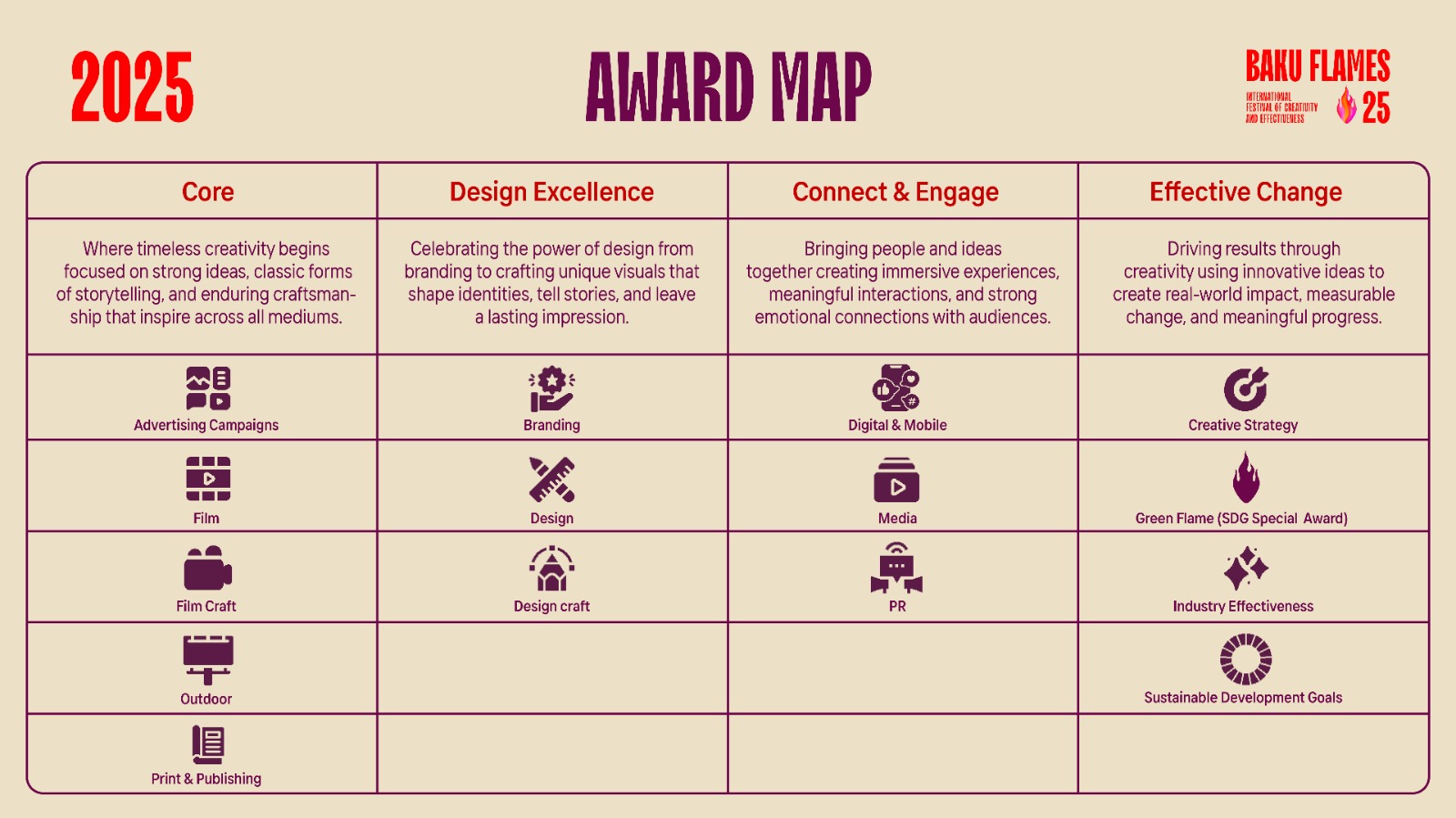 Festivalın önəmli və gözlənilən hadisələrindən biri də, şübhəsiz, “Baku Flames Mükafatlandırma Mərasimi”dir. Bu möhtəşəm tədbir festivalın ikinci günündə ən yaradıcı, innovativ və effektiv kampaniyaları, eləcə də fərqli ideyaları və istedadları təltif edəcək. Kateqoriyalar üzrə namizədlər beynəlxalq münsif heyəti tərəfindən qiymətləndiriləcək və qaliblər festivalın 2-ci günündə elan olunacaq. Qeyd edək ki, erkən müraciət mərhələsi yanvar ayının sonunda açıq elan ediləcək və həmin tarixdən etibarən festival biletləri də www.bakuflames.az ünvanında satışa təqdim olunacaq.