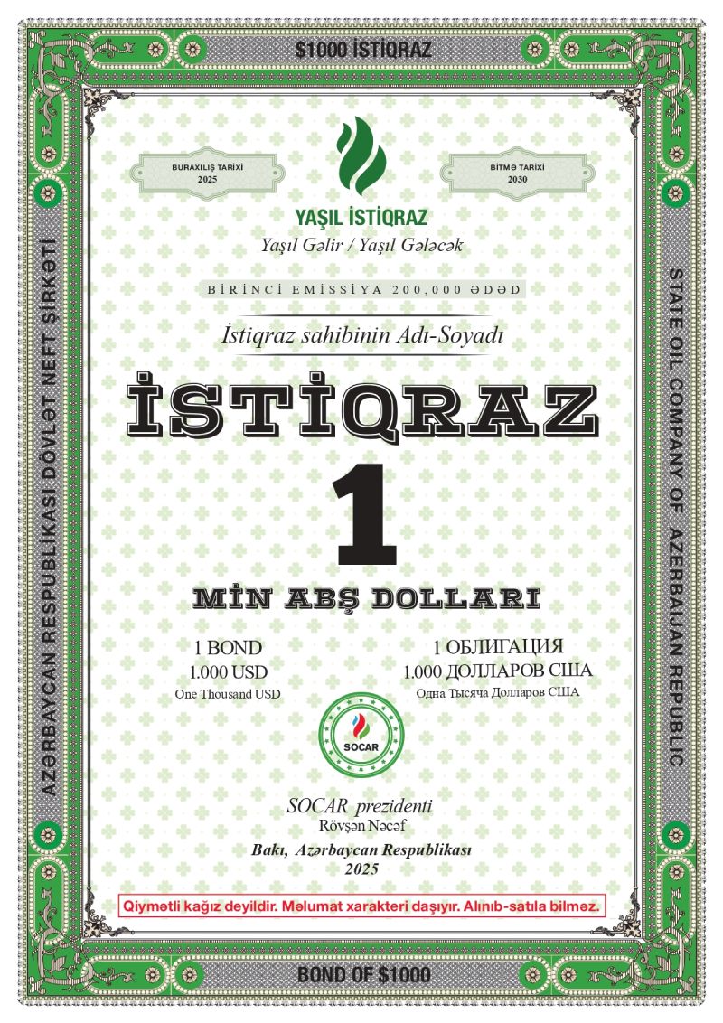Ümumi buraxılış məbləği 200 milyon ABŞ dolları olan və 5 illik müddətə buraxılan "Yaşıl" istiqrazların kupon ödənişləri hər 3 aydan bir ödəniləcək. SOCAR-ın “yaşıl” istiqrazlarını əldə etmək üçün son tarix 28 fevral 2025-ci ildir.