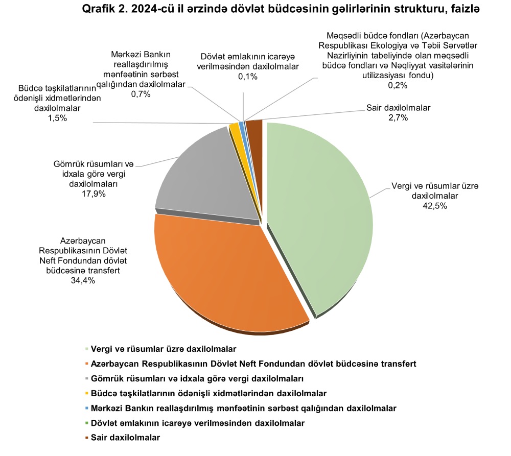 2024-cü ilin dövlət büdcəsinin gəlirlərinin 15 milyard 808 milyon manatı və ya 42,5 faizi vergi və rüsumlar üzrə daxilolmalarının, 12 milyard 781 milyon manatı və ya 34,4 faizi Azərbaycan Respublikasının Dövlət Neft Fondundan dövlət büdcəsinə transfertin, 6 milyard 648,7 milyon manatı və ya 17,9 faizi gömrük rüsumları və idxala görə vergi daxilolmalarının, 547,9 milyon manatı və ya 1,5 faizi büdcə təşkilatlarının ödənişli xidmətlərindən daxilolmaların, 250 milyon manatı və ya 0,7 faizi Mərkəzi Bankın reallaşdırılmış mənfəətinin sərbəst qalığından daxilolmaların, 37,6 milyon manatı və ya 0,1 faizi dövlət əmlakının icarəyə verilməsindən daxilolmaların, 1 milyard 21,1 milyon manatı və ya 2,7 faizi sair daxilolmaların, 69,9 milyon manatı və ya 0,2 faizi məqsədli büdcə fondları (Azərbaycan Respublikası Ekologiya və Təbii Sərvətlər Nazirliyinin tabeliyində olan məqsədli büdcə fondları və Nəqliyyat vasitələrinin utilizasiya fondu) üzrə daxilolmaların payına düşür.