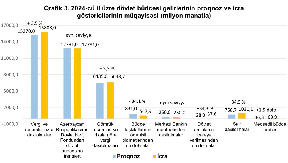 2024-cü ildə dövlət büdcəsinin gəlirləri üzrə təsdiq edilmiş proqnozdan vergi və rüsumlar üzrə daxilolmalar 538 milyon manat və ya 3,5 faiz, gömrük rüsumları və idxala görə vergi daxilolmaları 213,7 milyon manat və ya 3,3 faiz, dövlət əmlakının icarəyə verilməsindən daxilolmalar 9,6 milyon manat və ya 34,3 faiz, məqsədli büdcə fondları (Azərbaycan Respublikası Ekologiya və Təbii Sərvətlər Nazirliyinin tabeliyində olan məqsədli büdcə fondları və Nəqliyyat vasitələrinin utilizasiya fondu) üzrə daxilolmalar 33,6 milyon manat və ya 1,9 dəfə, sair gəlirlər üzrə daxilolmalar isə 264,4 milyon manat və ya 34,9 faiz çox, büdcə təşkilatlarının ödənişli xidmətlərindən daxilolmalar 283,1 milyon manat və ya 34,1 faiz az təmin edilmişdir.