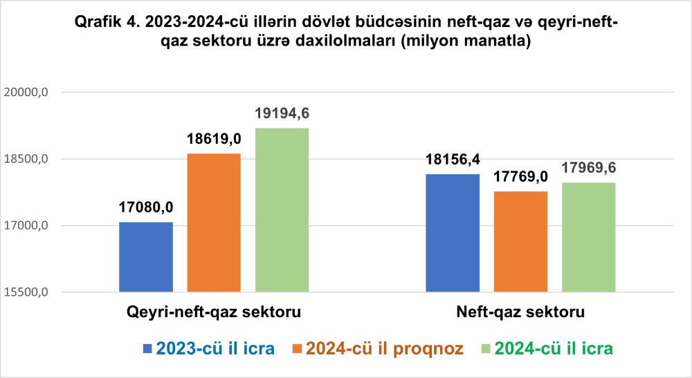 2024-cü ilin dövlət büdcəsinin gəlirlərində neft-qaz sektoru üzrə daxilolmaların 26,6 faizi və ya 4 milyard 780,5 milyon manatı vergi orqanlarının xətti ilə daxilolmalar, 2,3 faizi və ya 408 milyon manatı sair daxilolmalar, 71,1 faizi və ya 12 milyard 781 milyon manatı Azərbaycan Respublikasının Dövlət Neft Fondundan dövlət büdcəsinə transfert təşkil edir.