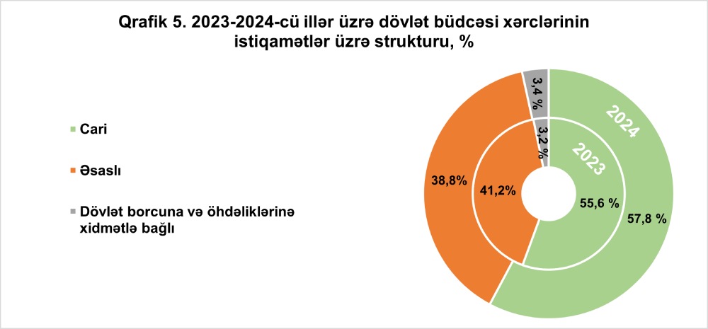 2024-cü il dövlət büdcəsi xərclərinin 21 milyard 800,3 milyon manatı və ya 57,8 faizi cari xərclərə (2023-cü illə müqayisədə 1 milyard 532,2 milyon manat və ya 7,6 faiz çox), 14 milyard 623,8 milyon manatı və ya 38,8 faizi əsaslı xərclərə (2023-cü illə müqayisədə 383,5 milyon manat və ya 2,6 faiz az), 1 milyard 295,6 milyon manatı və ya 3,4 faizi dövlət borcuna xidmətlə bağlı xərclərə (2023-cü illə müqayisədə 113,1 milyon manat və ya 9,6 faiz çox) yönəldilmişdir.