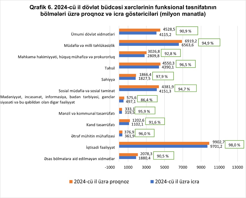 2024-cü il üzrə funksional təsnifata müvafiq olaraq iqtisadi fəaliyyət xərcləri 98,0 faiz və ya 9 milyard 701,2 milyon manat, səhiyyə xərcləri 97,9 faiz və ya 1 milyard 827,5 milyon manat, təhsil xərcləri 96,5 faiz və ya 4390,1 milyon manat, ətraf mühitin mühafizəsi xərcləri 96,0 faiz və ya 361,9 milyon manat, mənzil və kommunal təsərrüfatı xərcləri 95,9 faiz və ya 319,5 milyon manat, müdafiə və milli təhlükəsizlik xərcləri 94,9 faiz və ya 6 milyard 563,6 milyon manat, sosial müdafiə və sosial təminat xərcləri 94,7 faiz və ya 4 milyard 151,3 milyon manat, məhkəmə hakimiyyəti, hüquq mühafizə və prokurorluq bölməsi üzrə xərcləri 92,8 faiz və ya 2 milyard 809,8 milyon manat, kənd təsərrüfatı xərcləri 91,6 faiz və ya 1 milyard 102,1 milyon manat, ümumi dövlət xidmətləri xərcləri 90,9 faiz və ya 4 milyard 115,2 milyon manat, əsas bölmələrə aid edilməyən xidmətlər bölməsi üzrə xərcləri 90,5 faiz və ya 1 milyard 880,4 milyon manat, mədəniyyət, incəsənət, informasiya, bədən tərbiyəsi, gənclər siyasəti və bu qəbildən olan digər fəaliyyət xərcləri 86,4 faiz və ya 497,1 milyon manat təşkil etmişdir.