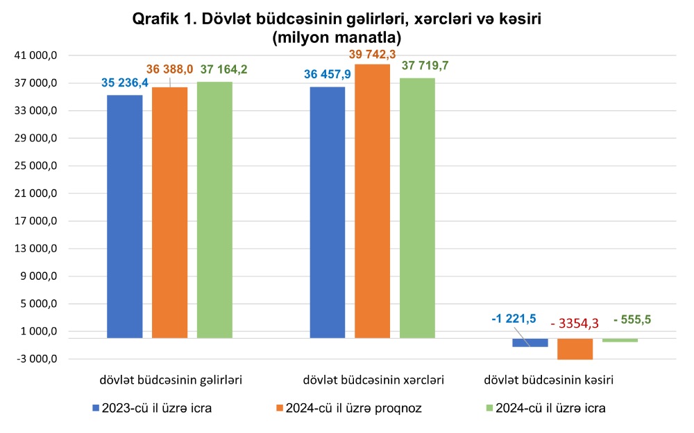 2024-cü ildə dövlət büdcəsinin gəlirləri 37 milyard 164,2 milyon manat, xərcləri 37 milyard 719,7 milyon manat olmuş, 555,5 milyon manat məbləğində dövlət büdcəsinin kəsiri (defisit) yaranmışdır.