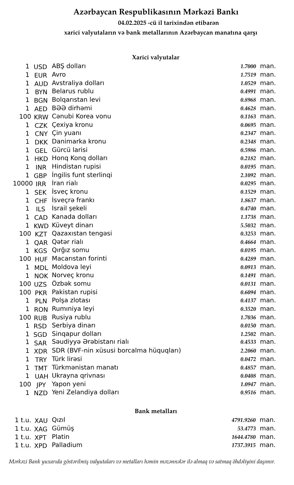Rəsmi məzənnələr açıqlandı