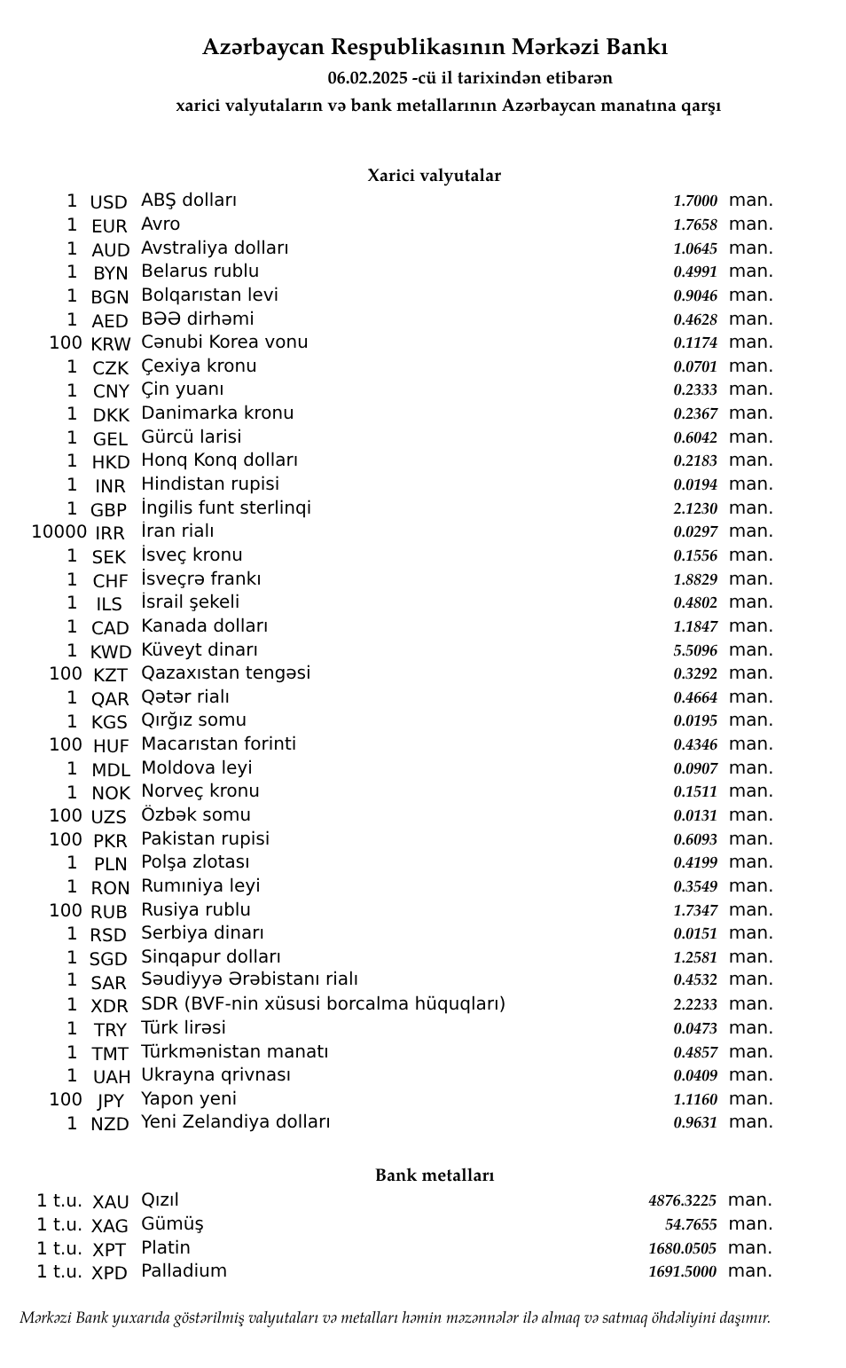 Rəsmi məzənnələr açıqlandı