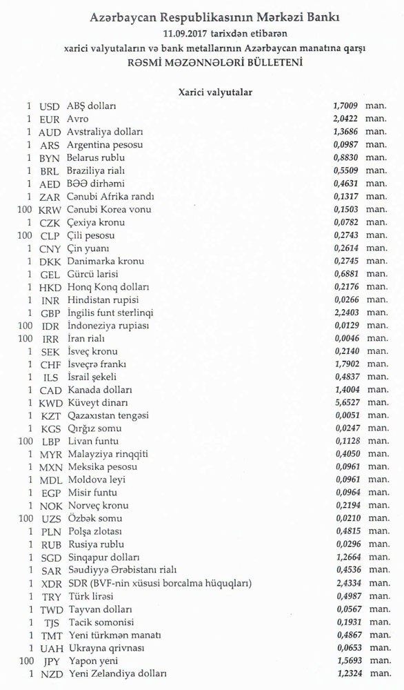 Sentyabrın 11-nə Mərkəzi Bankın açıqladığı rəsmi Dollar/manat məzənnəsi Sentyabrın 8-i ilə müqayisədə dəyişməyərək 1,7009 manat olub, Avro/manat məzənnəsi isə 2.0422 manata düşüb.